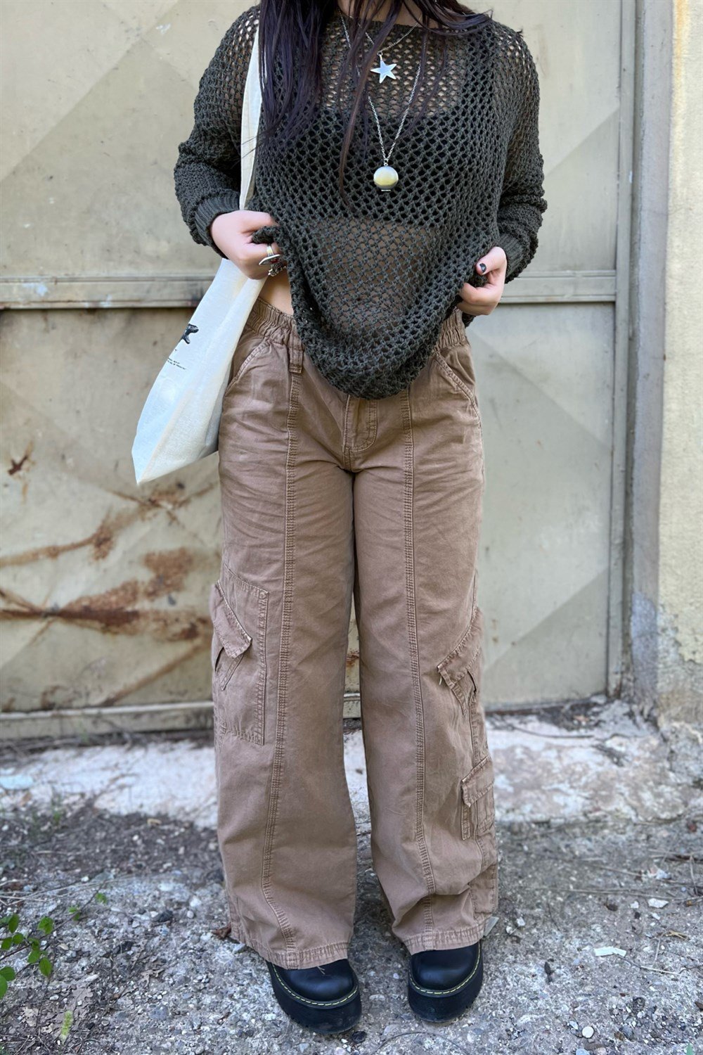 Y2k fashion style, which is the indispensable fashion of the 90s, Camel Cargo Trousers complement each other with stylish crops and bright accessories...